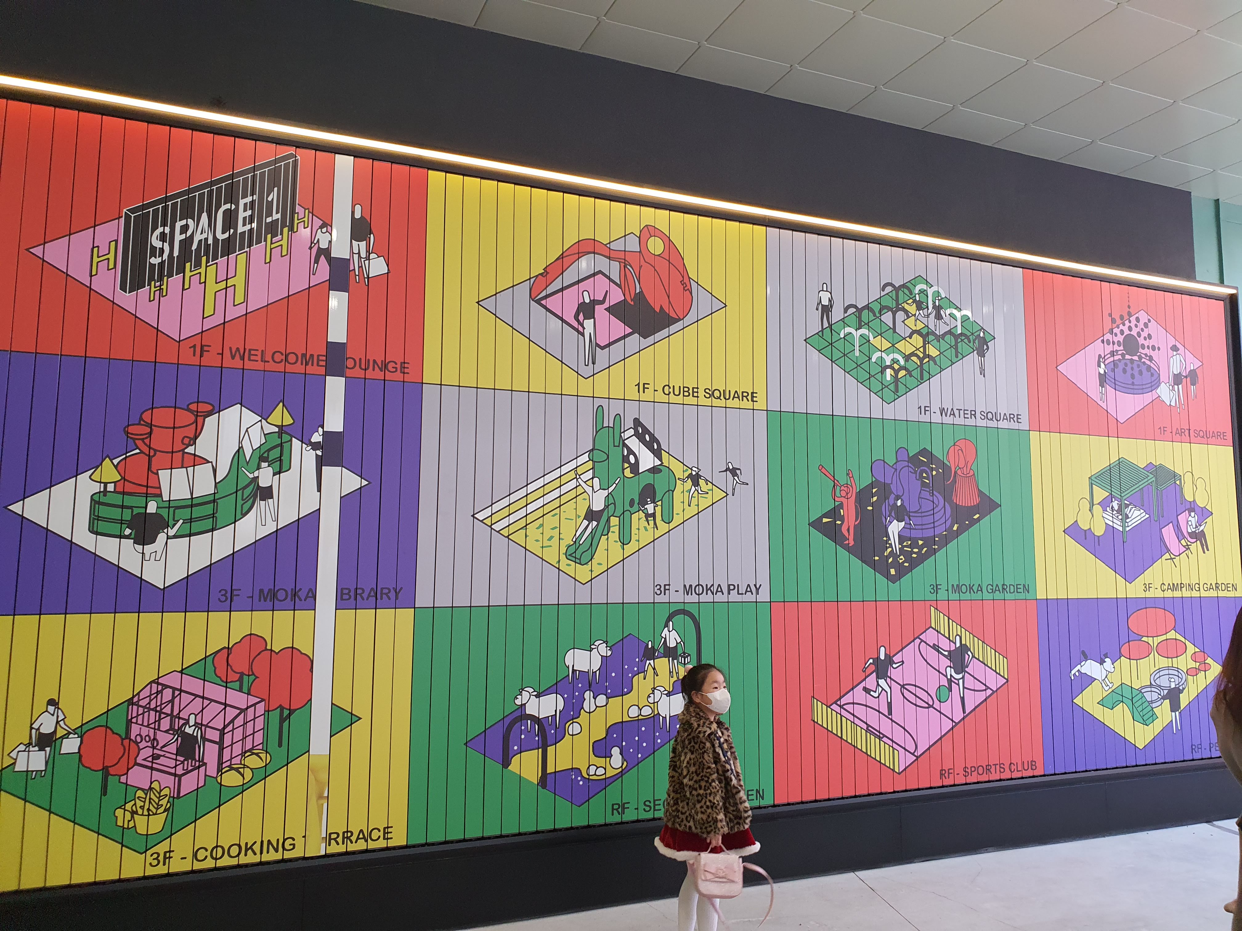 현대 프리미엄 아울렛 스페이스원 점은 가운데 중앙광장을 기점으로 직사각형으로 한바퀴 도는 5층으로 구성되어 있습니다. 실제 쇼핑몰과 편의시설은 주로 3층까지 있고, 4층은 야외 가든과 풋살, 농구장 등이 있는 스포츠 체험 공간, 5층은 메가박스 영화관으로 구성되어 있습니다.