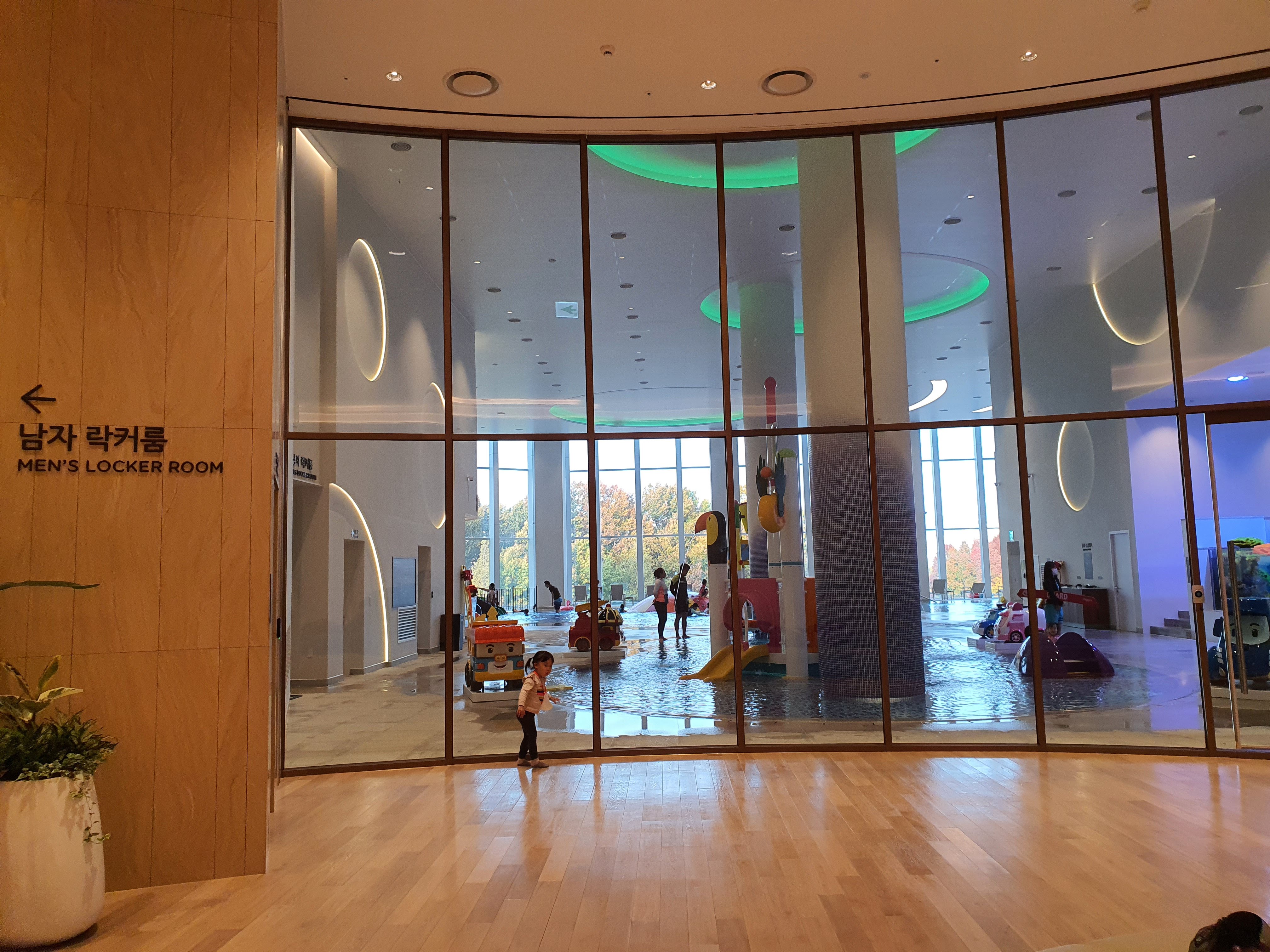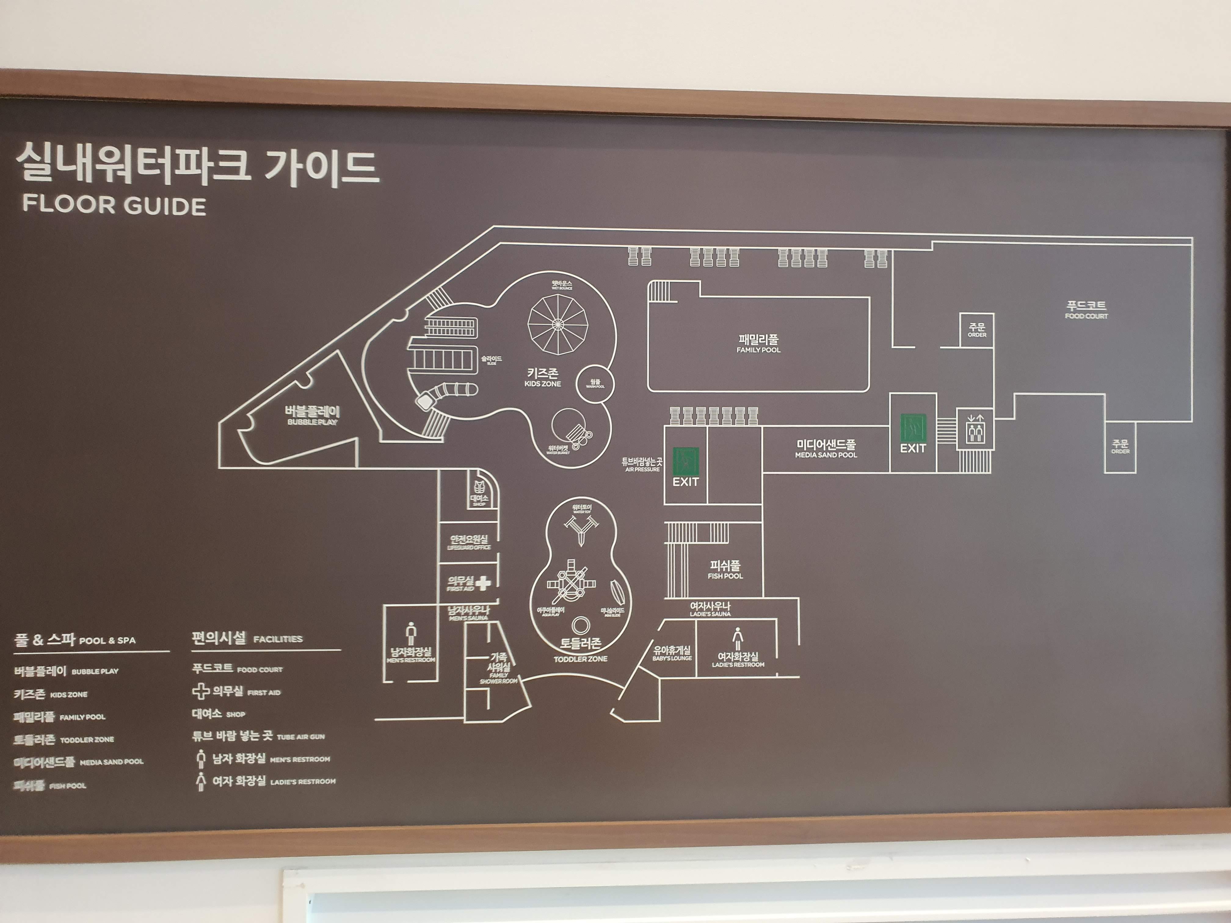 아쿠아필드는 하남점과 유사하게 찜질방, 인피니티풀 등이 있지만, 실내풀은 주로 키즈를 타겟으로 구성되어 있어 하남 아쿠아필드보다는 적은 규모입니다.